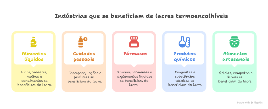 O uso do lacre termoencolhível é indicado sempre que há necessidade de proteger o conteúdo contra abertura indevida, vazamento ou contaminação. Isso vale especialmente em segmentos onde a integridade do produto é fundamental para o consumidor final.